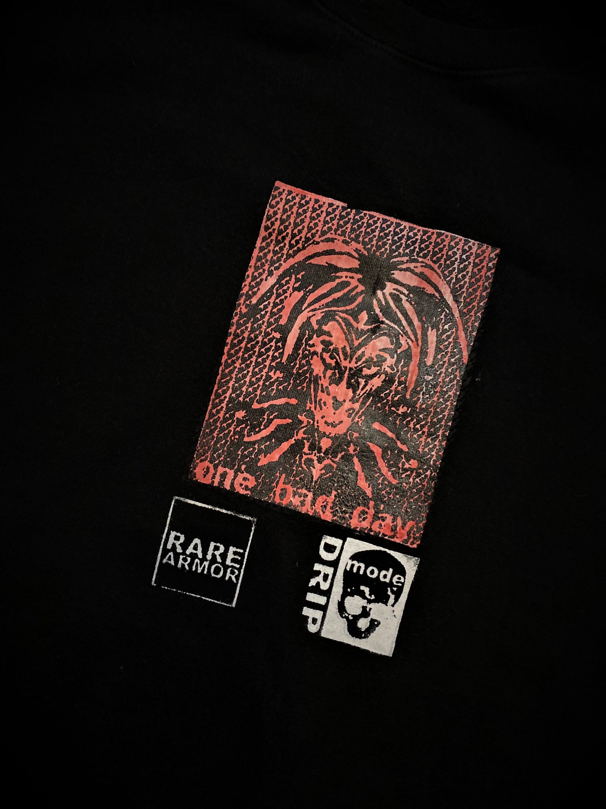 All garments screen-printed on upcycled fabrics. Handsewn tags